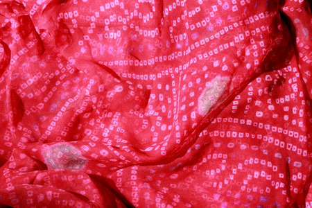 A vibrant Indian bandhani dupatta spread out under natural sunlight.