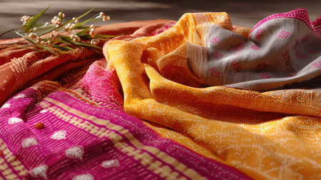 This image showcases a stunning array of traditional textiles featuring rich colors and intricate patterns, arranged elegantly on a soft fabric backdrop.