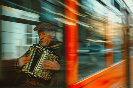 Young bearded musician playing accordion while sitting on stool in cobblestone street of charming european city, entertaining passersby with lively melodies and adding to the vibrant atmosphere