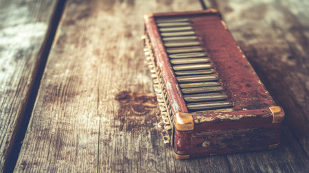 A close-up image of a vintage wooden harmonica lying on a distressed wooden surface, highlighting the beauty of craftsmanship and natural light.