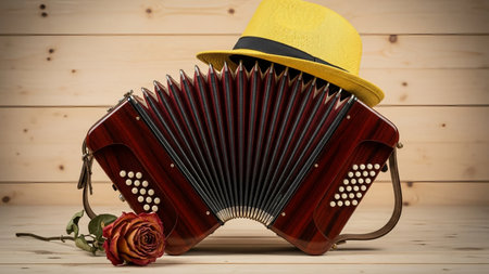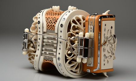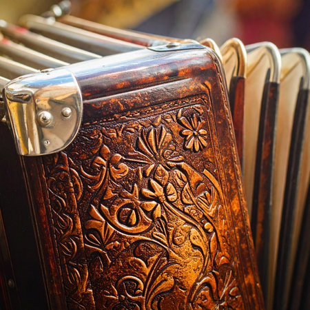A close-up view reveals the soul of a bygone era in the intricate floral carvings of a vintage wooden accordion.