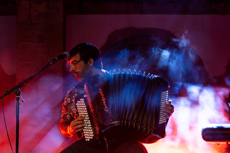 Concert view of accordion player performing on a stage with vocalist and jazz group band orchestra in the background, accordionist performance during music jazz live show