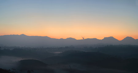 Beautiful view of the morning fog filling the valleys of smooth hills.