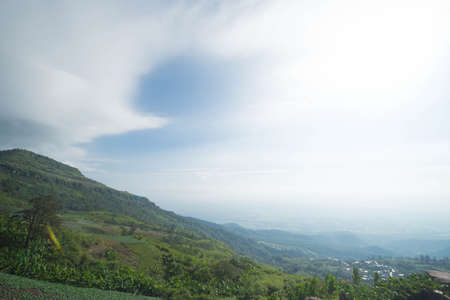 Vegetable plantation on mountain slope with sky at sunrise. The sky is cloudy in slope of Mount Sumbing. Silancur HIghland