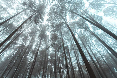 Beautiful aerial view of tea plantation with fog and highland background on misty morning in Pangalengan, Bandung, West Java, Indonesia