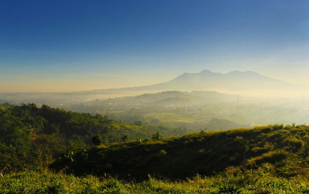 Magelang townsquare with iconic building in sunrise time with mountains on the background.