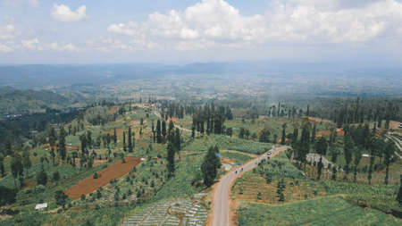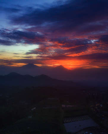 Beautiful aerial view of Silancur highland with misty mountain background. Shot in Magelang, Central Java, Indonesia