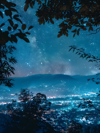Starry night reveals vibrant city lights against a contrasting dark sky