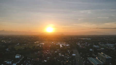 aerial view yogyakarta city cultural capital indonesia located on java island. Yogyakarta with buildings, highway at sunset time. aerial view