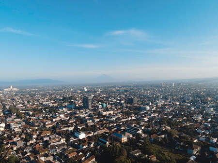 Aerial view of sunset Mount Merapi and Yogyakarta city, Indonesia. City with mountain background view.