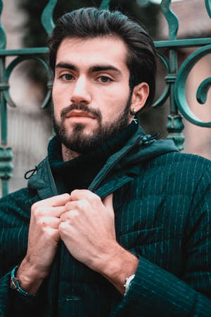 Handsome young man. Portrait of a young man in a jacket, stands on a black background