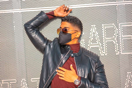 Fashion lifestyle, portrait of a young Latino man leaning against the wall. Jeans, leather jacket and brown shoes. In a pandemic with a mask