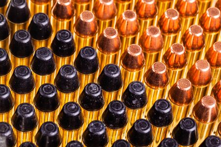 Top detail macro view of large group of gun bullets. Ammunition background pattern