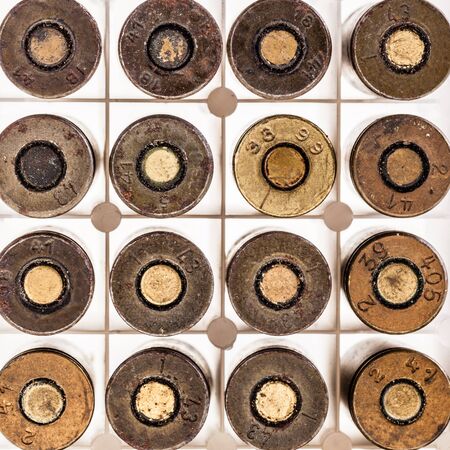 a lot of old handgun pistol bullets ammo isolated over a white background