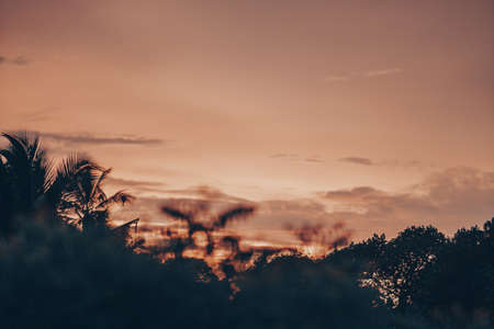 Beautiful view of green bushes tropical exotic trees on a background of blue clear sky with clouds. Postcard, poster. Copy space ideal for use in the design or wallpaper.
