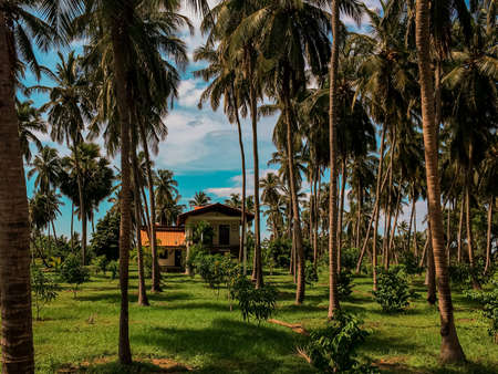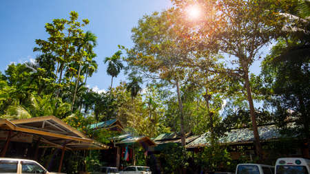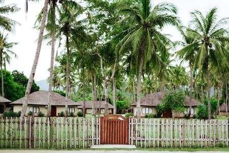 Yard with green trees in a cottage town in the tropics. Resort on the island.