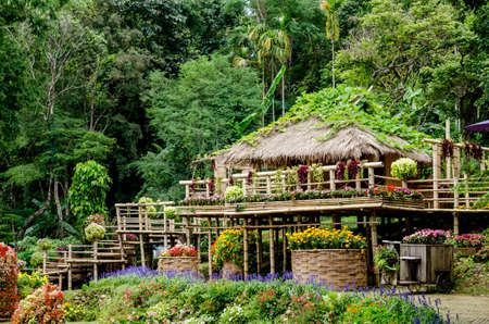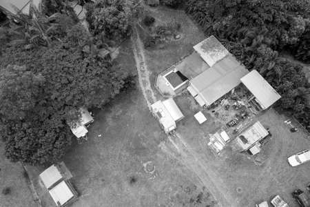 Aerial view of wooden resort homestay on hill in tropical rainforest on rural village at countryside