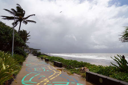 A public colorfully painted footpath leading into the distance beside the ocean on a wet and cloudy day