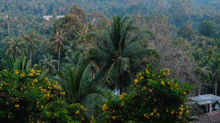 Enjoy a serene view showcasing lush tropical greenery filled with diverse vegetation and vibrant blooming flowers