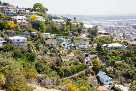Cosy traditional villas amongst mature trees and shrubs on the steep slopes ofr green mountain. Sunny spring day in Wellington, New Zealand
