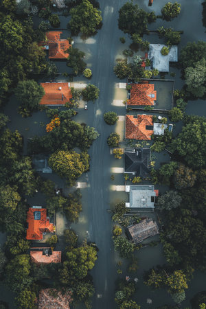 Aerial view of suburban properties partially submerged in murky floodwaters after a tropical storm, roads barely visible, rooftops and trees surrounded by water