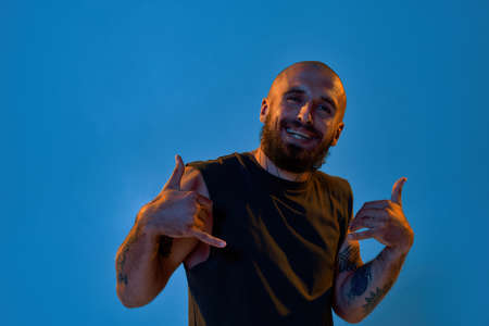 Blue cold. Cinematic portrait of stylish young man in neon lighted room. Bright neoned colors. Caucasian model, musician outdoors. Youth culture in party, festival style and music concept.