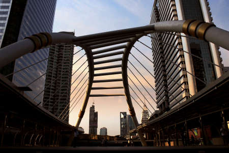 BANGKOK THAILAND MAY 15: Sky bridge link landmark of bangkok at SathornNarathiwas intersection among the highrise buildings on May 15 2015 in Bangkok Thailand.