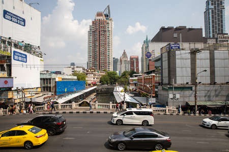 Bangkok, Thailand - February, 2020: View on busy road and Pratu Nam ferry terminal near Big C supermarket and Makkasan district