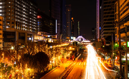 Bangkok,Thailand - 2 November 2017 : Night light with long speed shutter of traffic at MBK, BTS Siam interchange in front of Siam Discovery and Art Museum junction.This place is very famous shopping mall at central of Bangkok