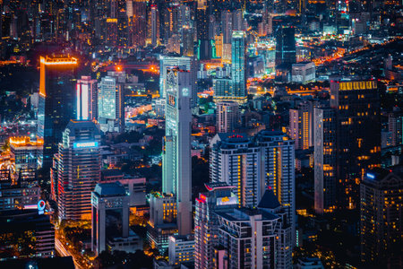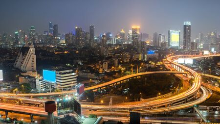 Business Building Bangkok city area at night life with transportation way logistic concept high angle bird eyes view