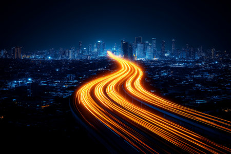 Captivating night cityscape showcasing illuminated highways and skyscrapers. The vibrant light trails create dynamic energy and movement.