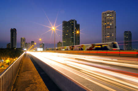 Sky train railway in metropolis in night life. Transportation concept.