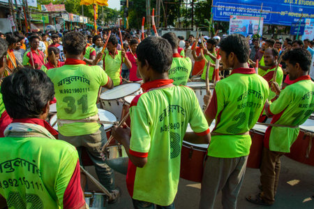 AMRAVATI, MAHARASHTRA, INDIA - 27 SEPTEMBER 2018: Crowd of unidentified people carrying Hindu God Ganesha for immersion with drums and music at water bodies during Ganesha festival. Annual festival.