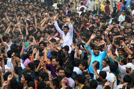 AMRAVATI, MAHARASHTRA, INDIA - AUGUST 24 : Crowd of young People enjoying Govinda at Dahi Handi festival to celebrate God Krishna's Birth in Amravati, Maharashtra, India. 24 August 2014