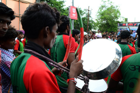 KOLKATA, WEST BENGAL / INDIA - AUGUST 15TH, 2016 : Folk dancers marching past in India's Independence day rally, with placards in their hands.