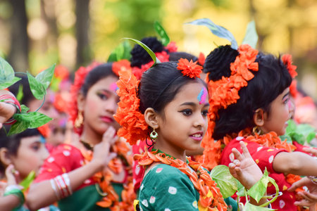 KOLKATA , INDIA - MARCH 12, 2017: Girl dancers, dressed in sari (traditional Indian dress) and Palash flowers (Butea monosperma) make up, dancing at Dol (in Bengali) or Holi (in Hindi) festival.