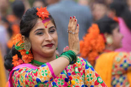 KOLKATA , INDIA - MARCH 12, 2017: Dancing pose of girl dancer, dressed in yellow and red coloured sari (traditional Indian dress) and flowers dancing at dol / holi festival.