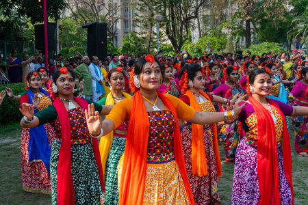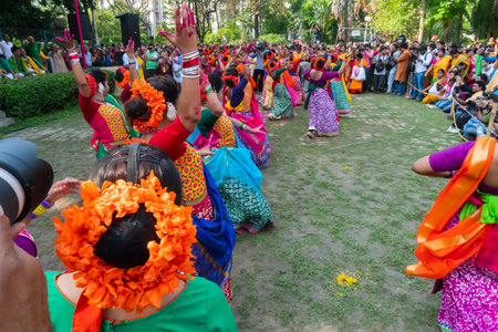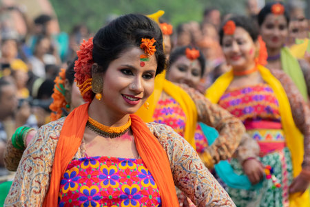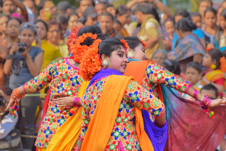 KOLKATA , INDIA - MARCH 12, 2017: Young girl dancers joyful dance at Holi/Spring festival,known as Dol (in Bengali) or Holi (in Hindi) celebrating arrival of Spring in India. Popular Indian festival.