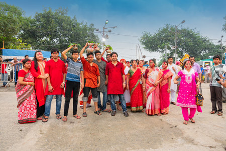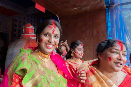 Kolkata,West Bengal,India - 9th October 2019 : Joyful Bengali married women in sindoor or sindur khela, traditional ritual of applying vermilion to faces, immersion of Goddess durga in Vijaya Dashami.
