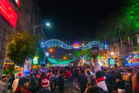 Kolkata, West Bengal, India - 26.12.2018 : Young people enjoying themselves at illuminated and decorated park street with lights with year end festive mood.