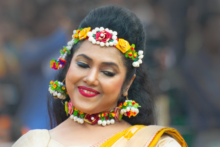 KOLKATA , INDIA - MARCH 1, 2018: Beautiful young girl with spring festive make up with flowers , at Holi/Spring festival,known as Dol (in Bengali) or Holi (in Hindi) celebrating arrival of Spring.