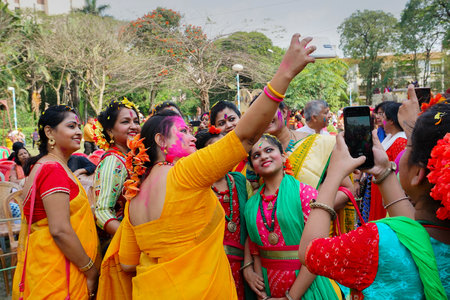 Kolkata, India - March 9th, 2020 : Beautiful young ladies in spring festive make up , taking groupfies at Holi festival, known as Dol (in Bengali) or Holi (in Hindi) celebrating arrival of Spring.