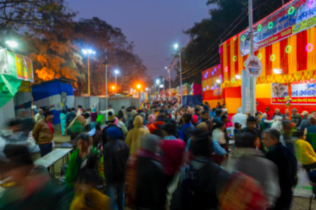 Blurred image of Hindu devotees walking in the evening at Gangasagar transit camp to visit Hindu sadhus at their camps , at Babughat, Kolkata, West Bengal, India.
