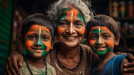 An Indian woman with colorful face looking at camera in holi - the festival of colors