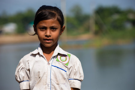 Taherpur, Bangladesh – November 05, 2019: Poor little school girl got ready to go to school during blood. Schoolgirl from a rural village wearing torn and dirty uniform to attend school.