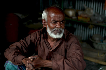 Bangladesh, Rangpur- July 12, 2021. An old man sitting in his shop with upset. his behind background blur.