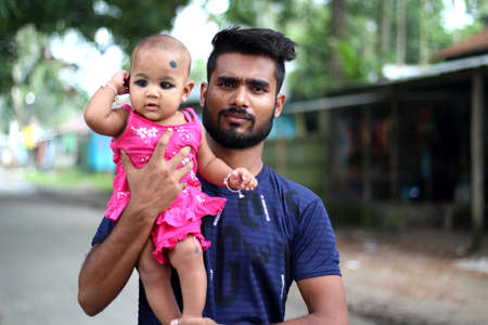 Bangladesh, Rangpur- July 18, 2021. A boy is standing in a pose with his baby and smiling and his background blur