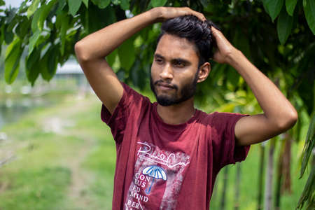 Bangladesh, Rangpur- July 03, 2021. A boy has two hands behind his head and the background behind him blurred