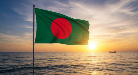 Bangladesh flag waving on the sea at sunset. 3d rendering