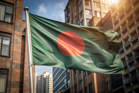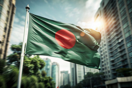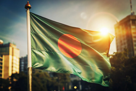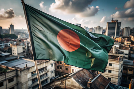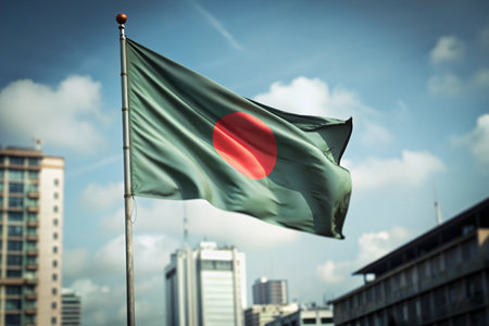 Bangladesh flag waving in the wind on top of the city